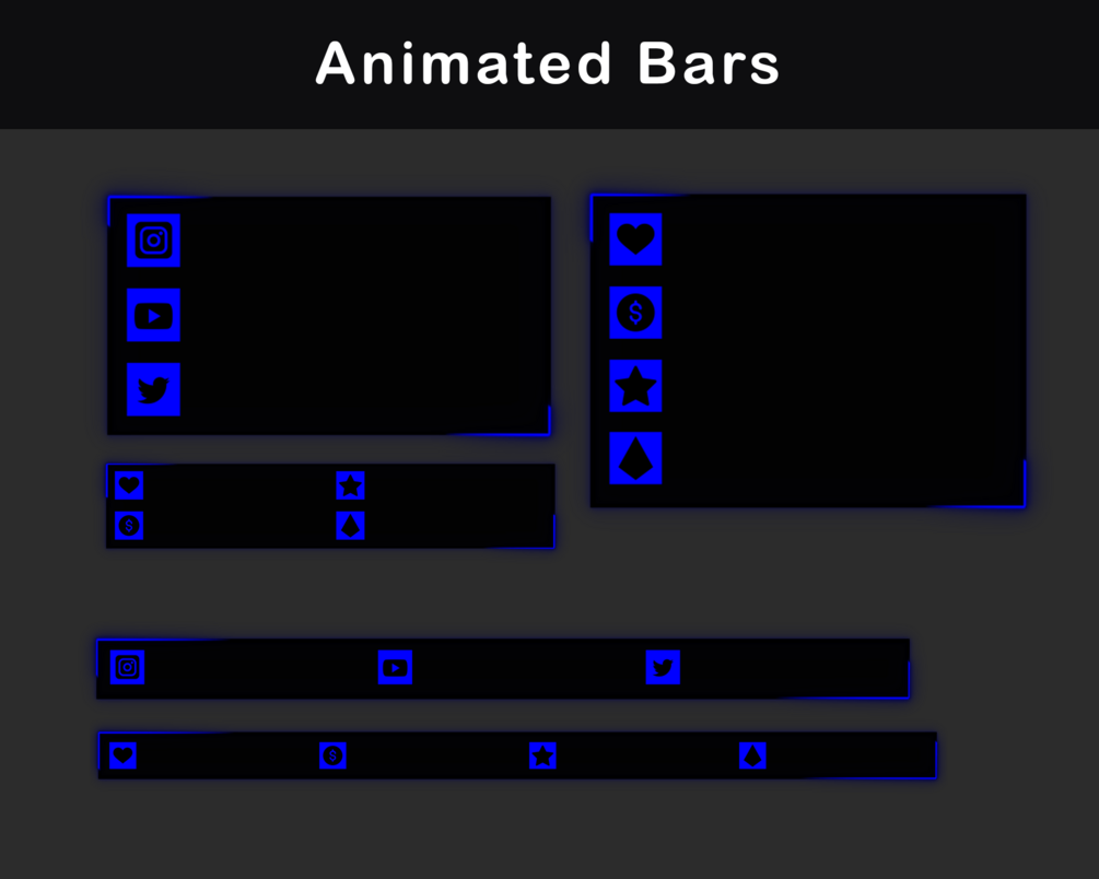 Twitch Overlay Animated Package Design in Black & Blue Minimalist Style with Subtle Glow. This Twitch stream overlay package offers a minimalist look featuring blue elements set against a black background. Overlay subtly glows, adding a delicate visual effect to your live stream. Ideal for those who appreciate a clean and subtle design.