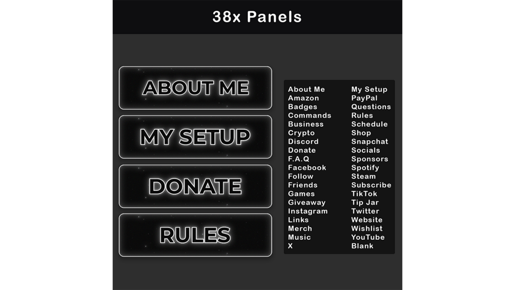 - 38 Twitch Panels: Covering essentials like About Me, Donate, My Setup, Rules, Socials, and more.