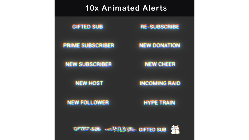 Gifted Sub, Hype Train, Incoming Raid, New Cheer, New Donation, New Follower, New Host, New Subscriber, Prime Subscriber, Re-Subscribe. -