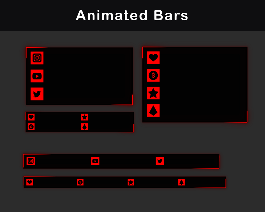 Twitch Overlay Animated Package Design in Black & Red Minimalist Style with Subtle Glow. This Twitch stream overlay package offers a minimalist look featuring red elements set against a black background. Stream overlay subtly glows, adding a delicate visual effect to your live stream. Ideal for those who appreciate a clean and subtle design.