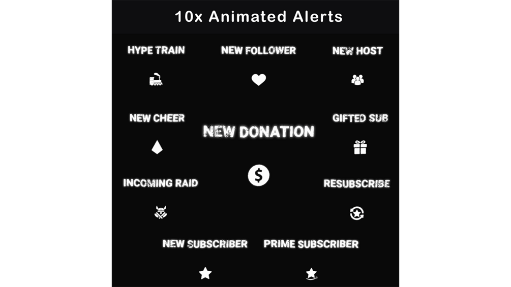 • 10 Animated Alerts (WebM, PNG): Gifted Sub, Hype Train, Incoming Raid, New Cheer, New Donation, New Follower, New Host, New Subscriber, Prime Subscriber, Resubscribe