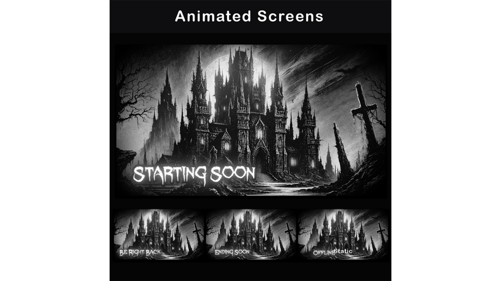 Twitch overlay pack, The Animated Horror stream overlay is designed in a dark gothic style, featuring a black and grey color scheme with eerie glowing text. The theme revolves around a haunted castle with sharp spires, twisted trees, and misty graveyards, evoking the atmosphere of classic horror and dark fantasy. The package includes animated overlays, intermission screens, alerts, stingers, and chatboxes, creating a seamless gothic stream layout.