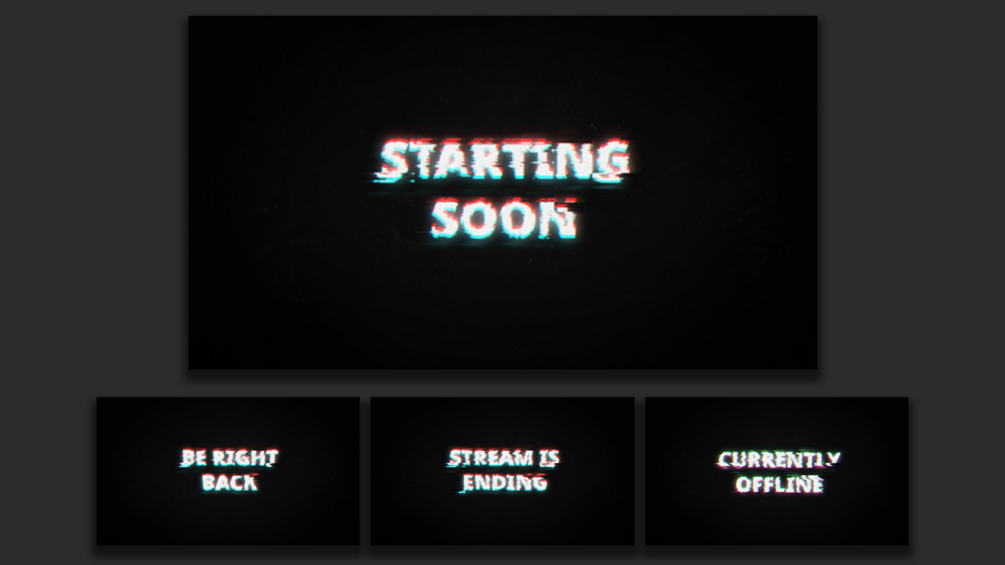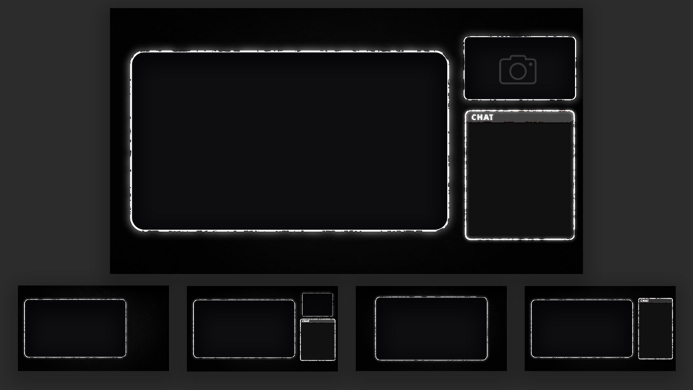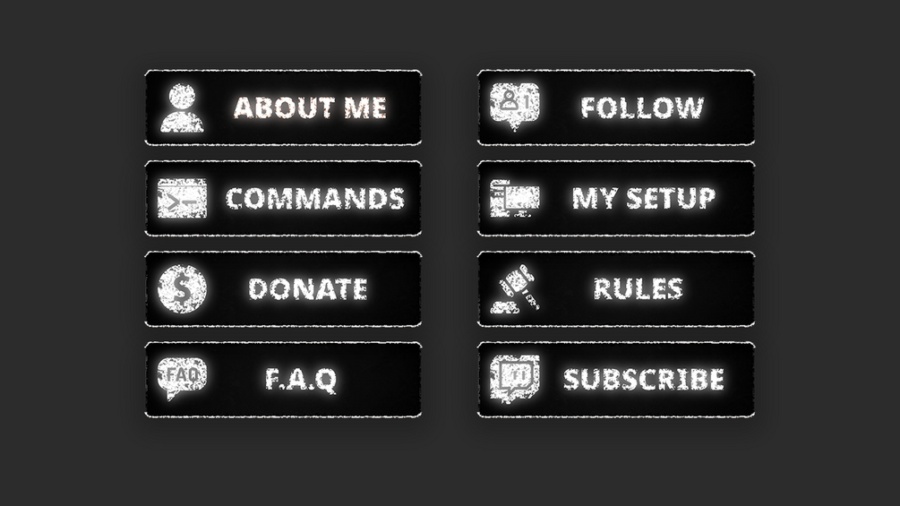 This Twitch Overlays package features a minimalist design in black and white. The animated text boasts a glitch effect with a neon glow. Each component is crafted for simplicity, making this stream pack not overwhelming for your viewers. The design is simple, eliminating unnecessary graphics for a clean look.